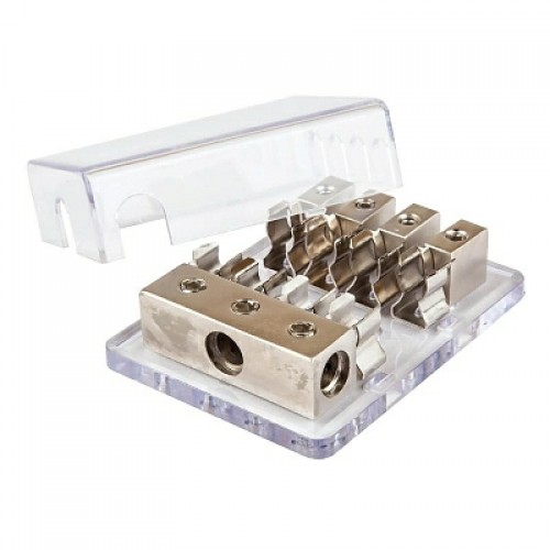 Автомобильный дистрибьютор питания. 3x2GA (33 мм2) или 3x4GA (21 мм2) входа/4x8GA (8 мм2) выхода. 4 держателя для предохранителя типа AGU....