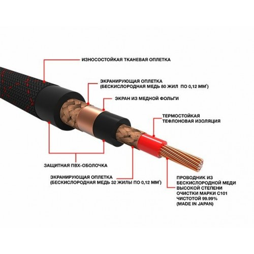 Экранирование Тройной экран для защиты от помех и наводок (сетка из чистой бескислородной меди состоящая из 12 жил сечением 0,12 мм каждая+медная фольга + сетка из чистой бескислородной меди состоящая из 80 жил сечением 0,12 мм каждая)
